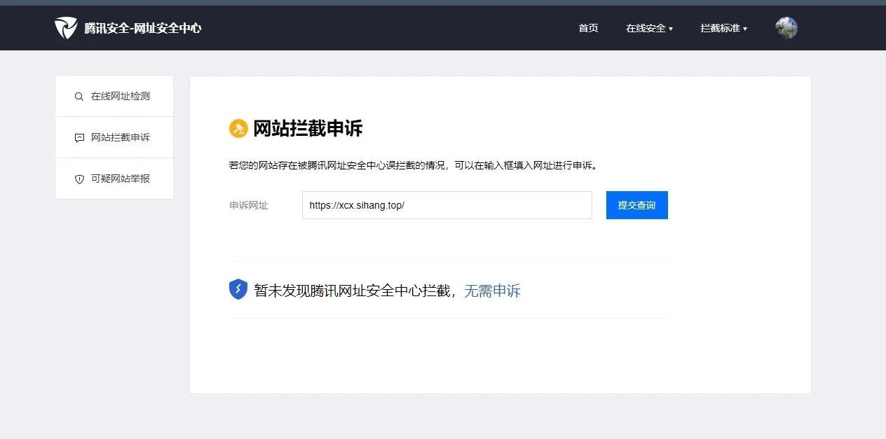 您好,我是网站开发者,网址https://xcx.sihang.top/浏览器访问正常,域名sihang.top备案完成,腾讯安全网址安全中心检测无问题