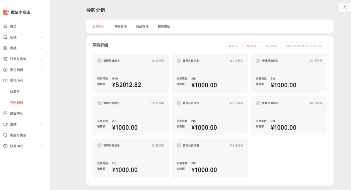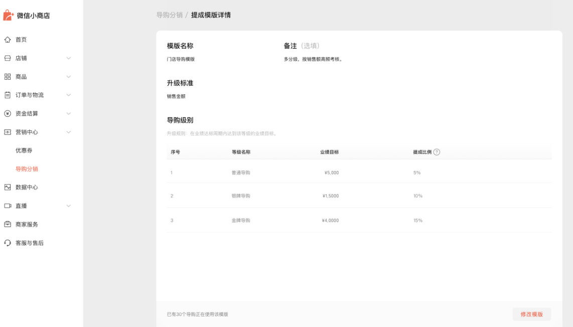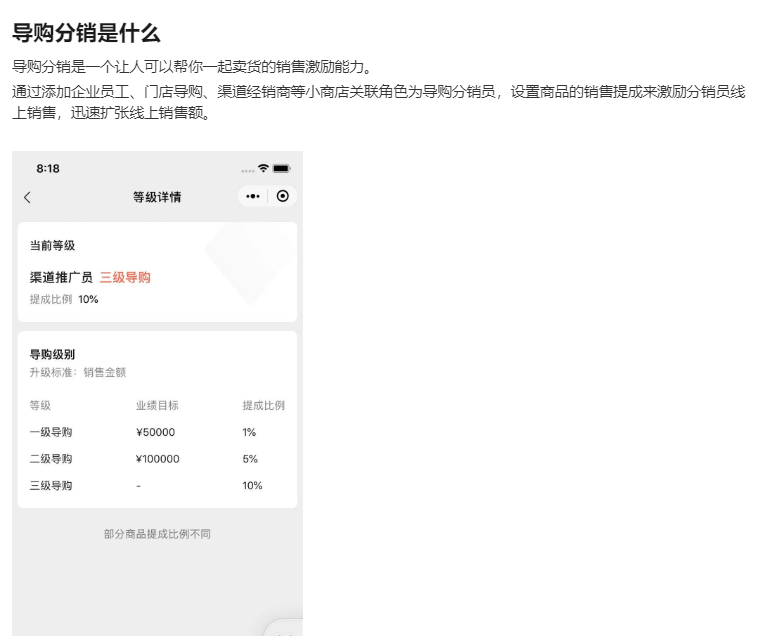 官方文章传送门:导购分销 - 用销售激励,让人一起帮你卖货(内测中)? - 微信开放社区 https://developers.weixin.qq.com/community/business/doc/000cc6f0030558c19f2be29365100d