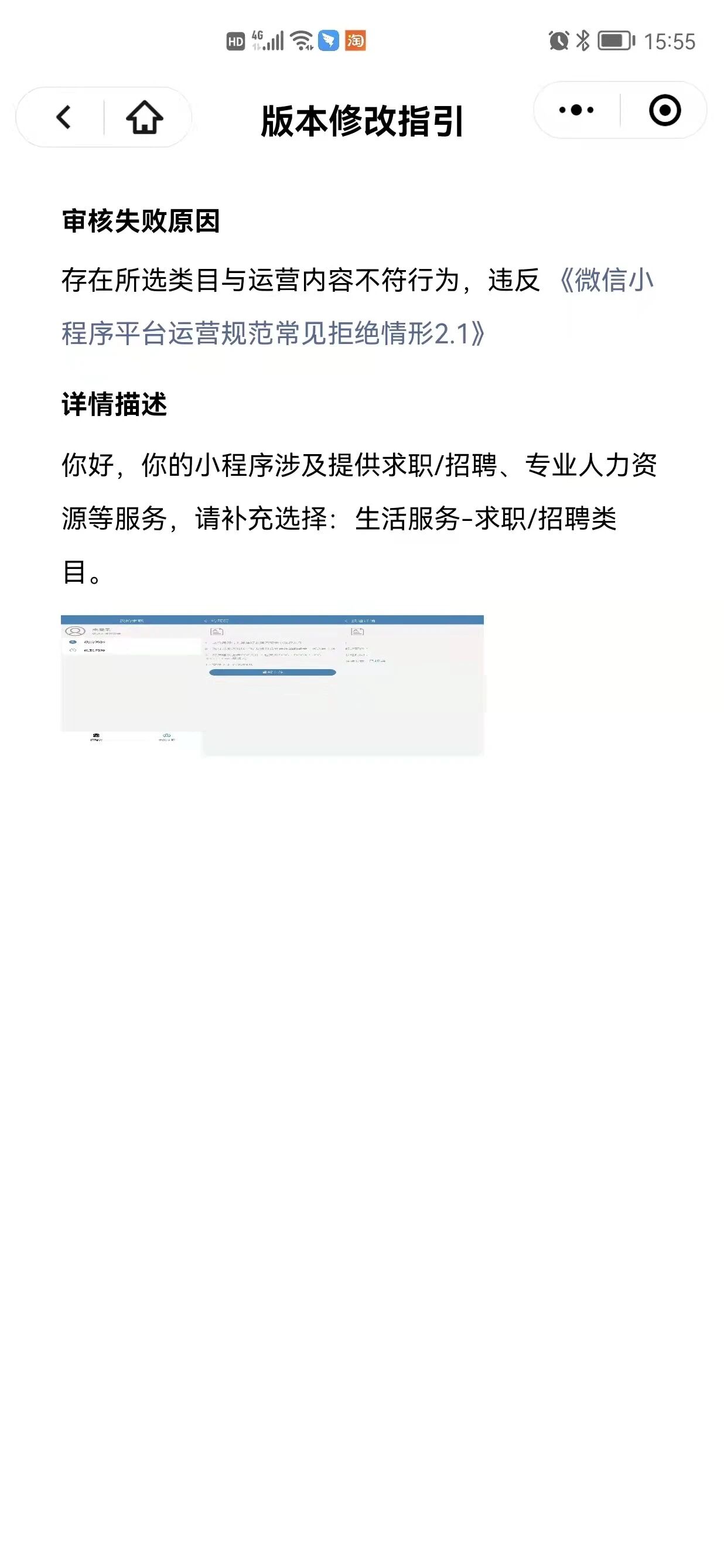 你好,经核实,你的小程序涉及提供求职/招聘、专业人力资源等服务,请补充选择:生活服务-求职/招聘类目,或小程序内整体移除上述服务后再重新提交代码审核。
