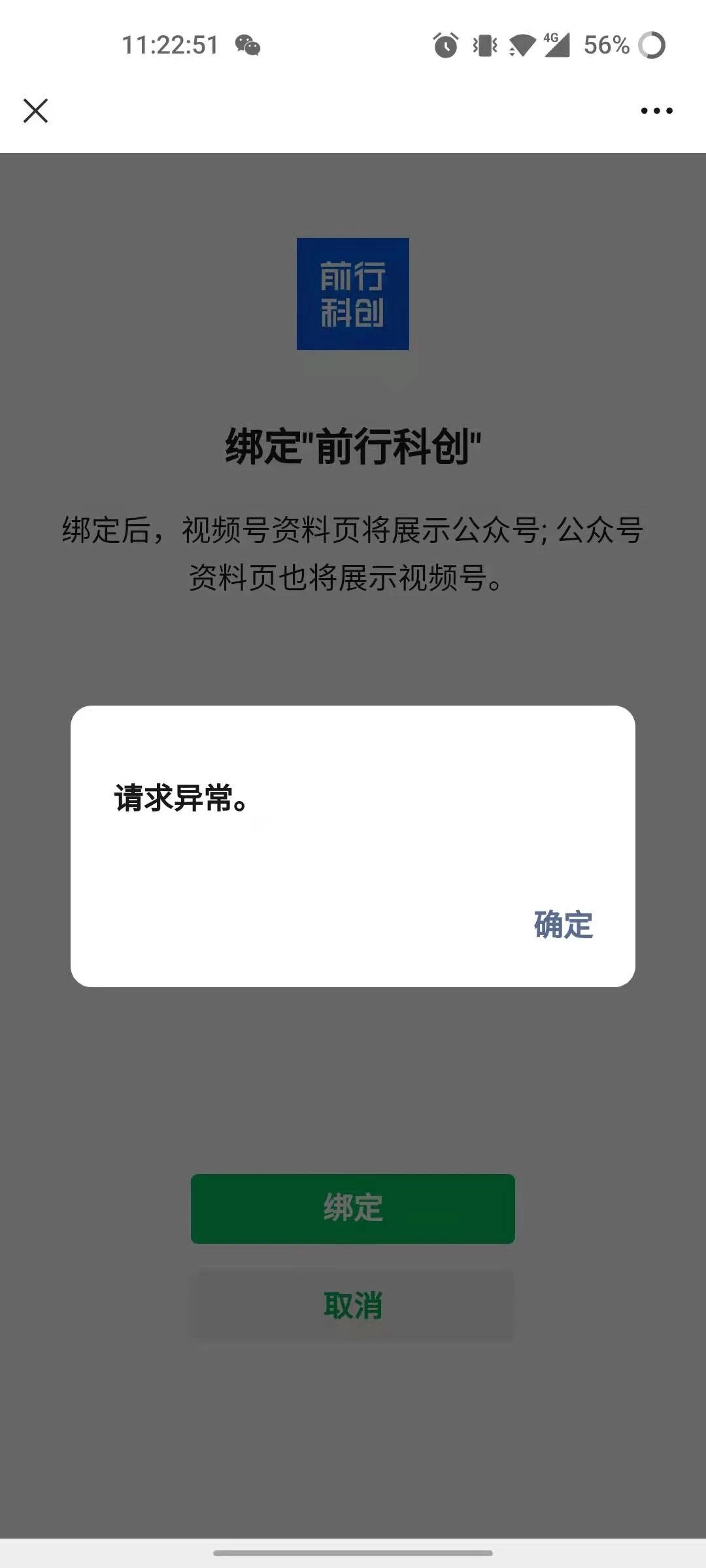 5. 问题描述:视频号绑定公众号的时候提示“请求异常”