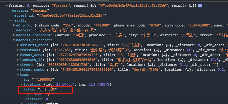 点击确认后,返回的行政辖区为万江街道,此位置应属于莞城街道的
