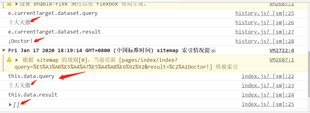 这是最后打印的信息,最开始的在histoyr.js里面存在query和result,但是到了index.js文件里面打印出的只有传过来的query,但是没有result