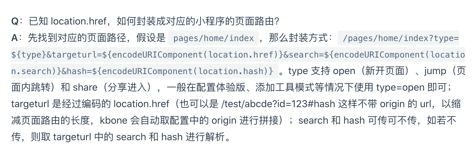 非 kbone 页面分享 kbone 页面,需要拼出对应的 url,因为存在单页的情况下,一个页面是可能有多个 url 的,所以 url 需要单独拼在页面路径后面: