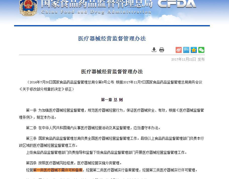 为此 我们还专门了打电话去跟食药监他们咨询,说:规定一类医疗器械只有备案凭证,没有生产经营许可证。第二、我司是销售公司,只要工商允许售卖医疗器械就ok