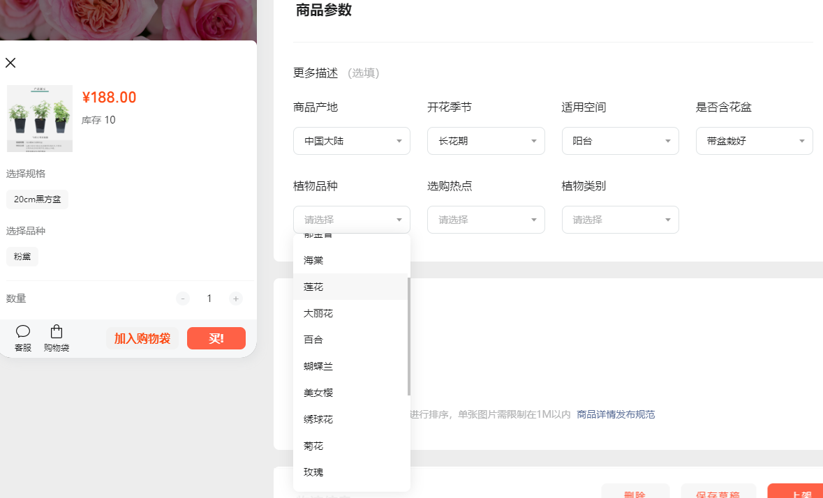 月季可是花卉行业里的名角呀,另外选购热点、植物类别、适用空间,建议是多选,因为确实可以选择,另外还可以增加:全日照/半日照/全阴,这个选项,这样对客户来说,基础了解到养护环境,也建议官方多补充其他类型