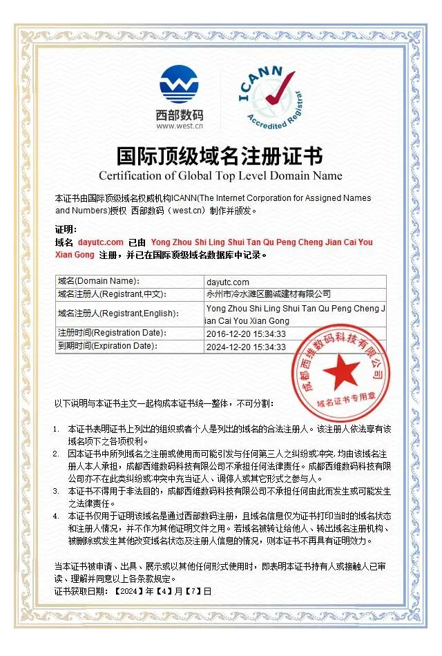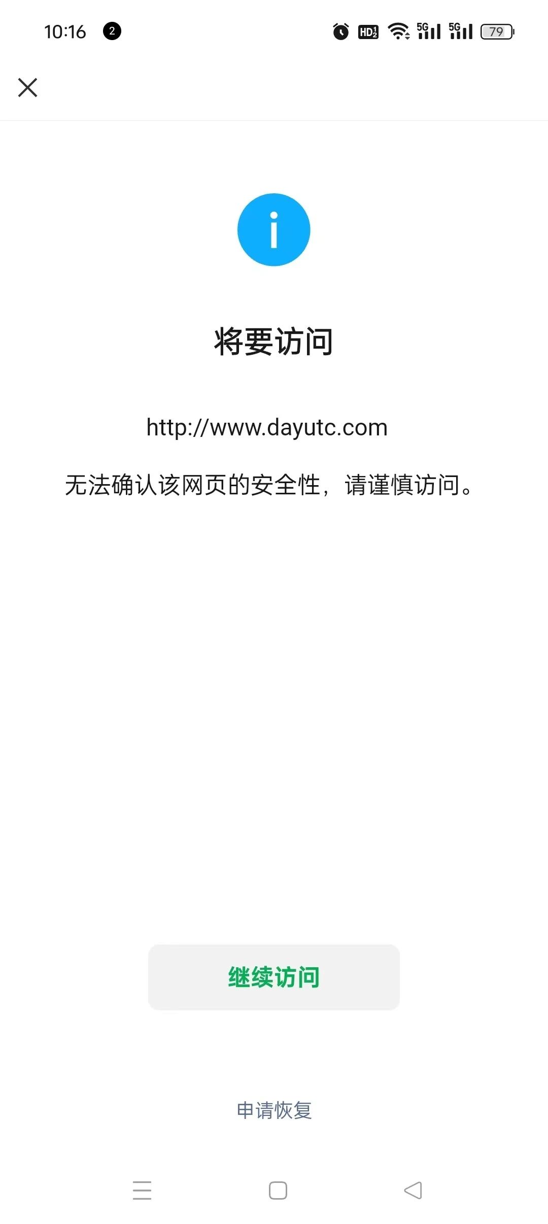 网站: www.dayutc.com 在微信中访问企业网址提示无法确认该网页的安全性,请谨慎访问? dayutc.com 域名备案为永州市冷水滩区鹏诚建材有限公司企业官网,社会信用代码,91431103MA4TC9GK6M,介绍本公司建材业务,网站内容为本公司建材产品和业务介绍,安全合规,请求恢复安全访问。