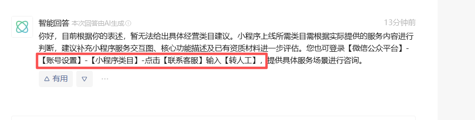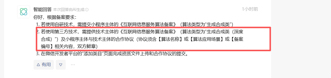 你好,你的小程序涉及提供文本深度合成技术 (如: AI问答) 等相关服务,请补充选择:深度合成-AI问答类目,并在AI生成页面增加显著说明“AI生成、人工智能生成”或同等含义字样。