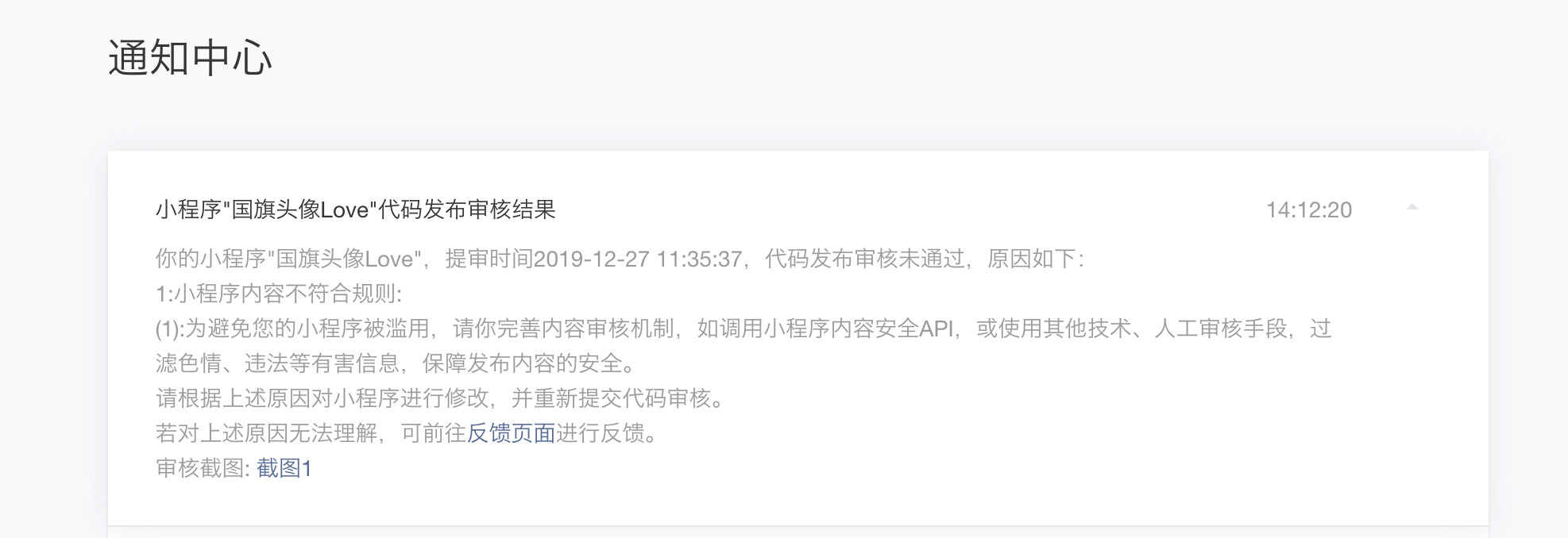 你的小程序"国旗头像Love",提审时间2019-12-25 11:05:28,代码发布审核未通过,原因如下: