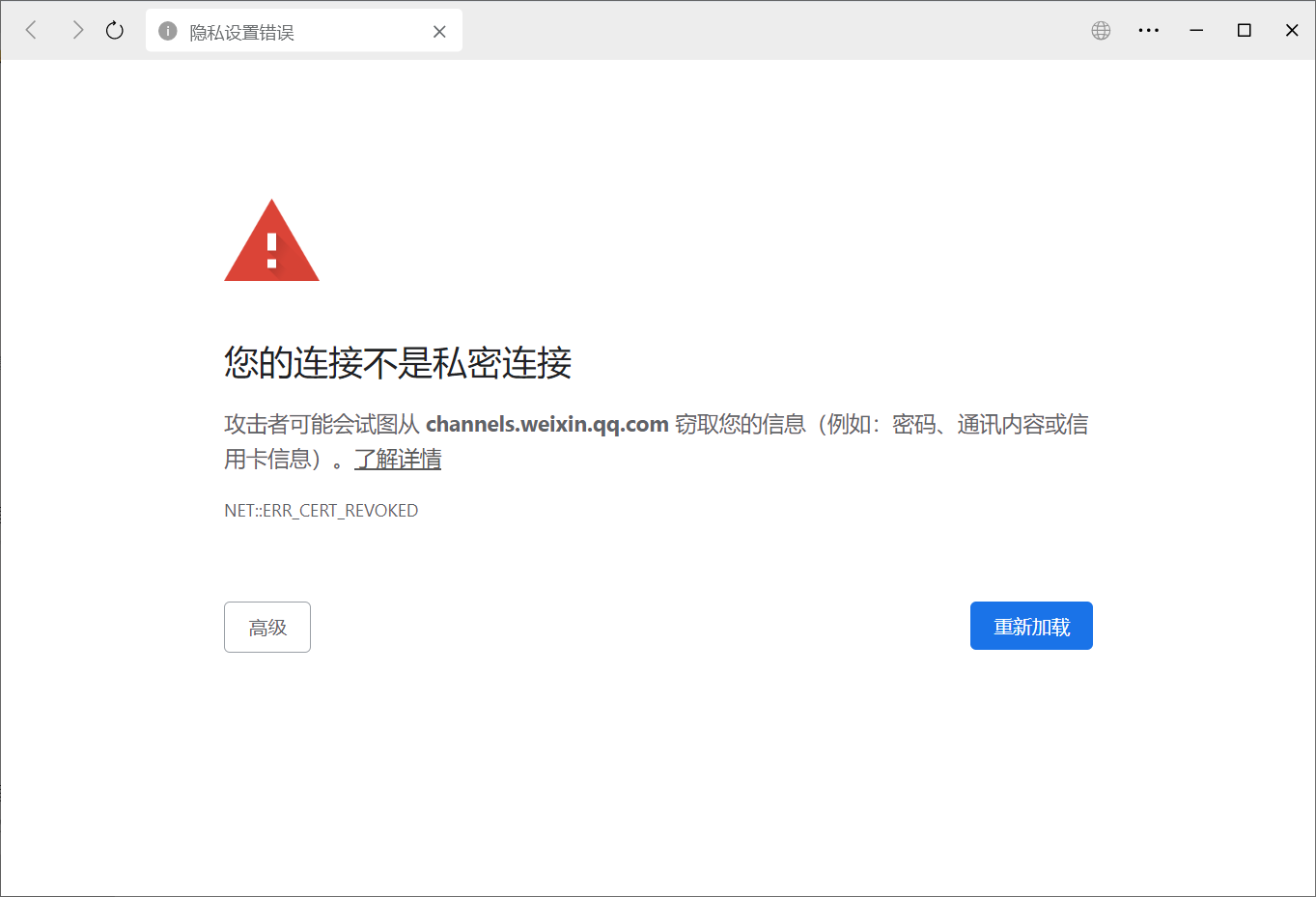 微信电脑版在打开订阅号文章网页,以及微信群里发的视频号视频、共享文档时,就会出现图片这种问题,“隐私设置错误”,以及“您的连接不是私密连接”这些问题,微信设置成以系统默认浏览器打开,视频号和共享文档还是这个问题