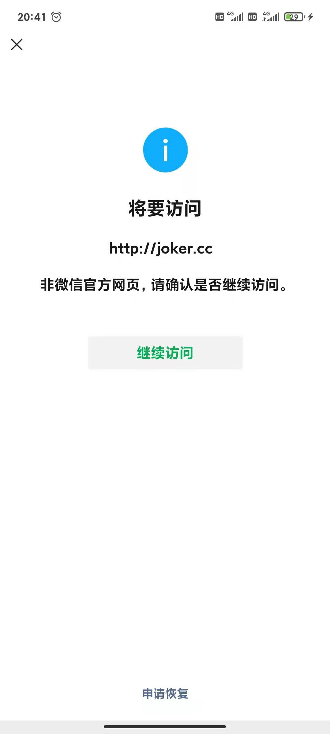域名joker.cc为我的个人博客网站,没有违规内容,但是被微信拦截了,申诉了好多次都没有回复。希望微信大大能帮下忙,恢复一下,拜托。