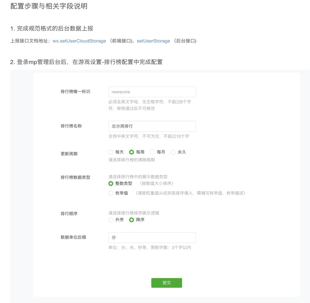 然后才能在游戏设置->排行榜配置中配置详情可参考排行榜配置指引:https://developers.weixin.qq.com/minigame/dev/tutorial/open-ability/ranklist.html