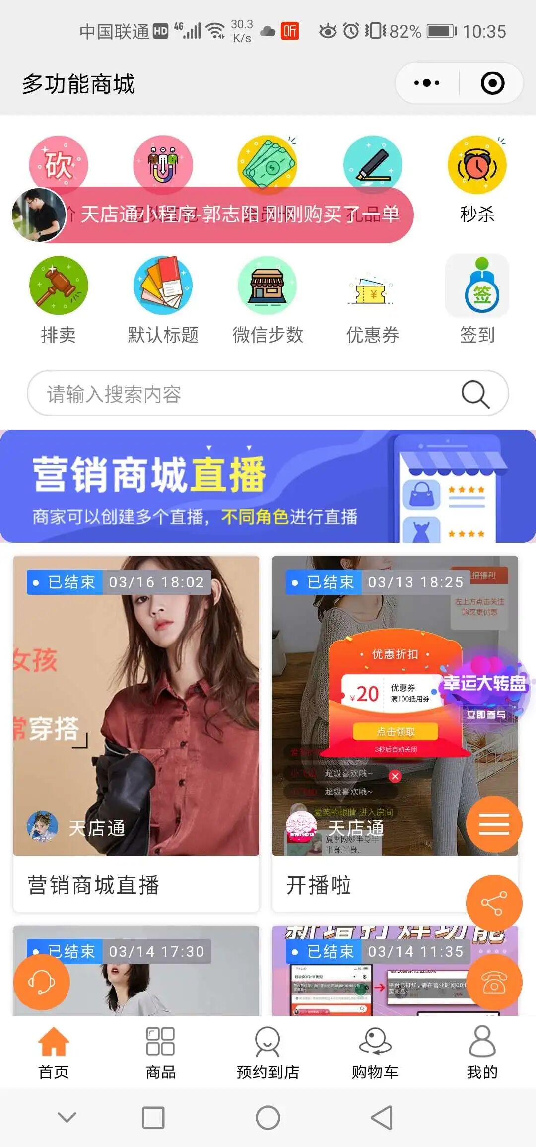 可以借助第三方开发平台。已开通直播案例。可以搜索小程序“多功能商城”进行观看。