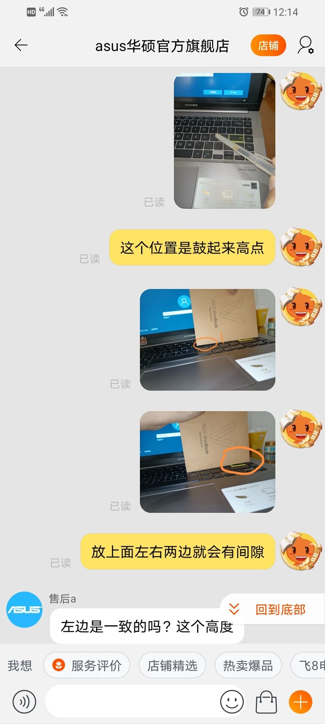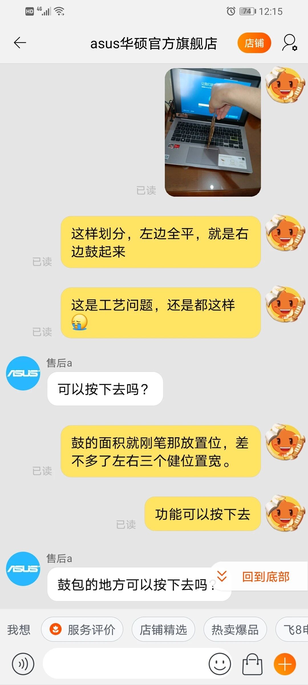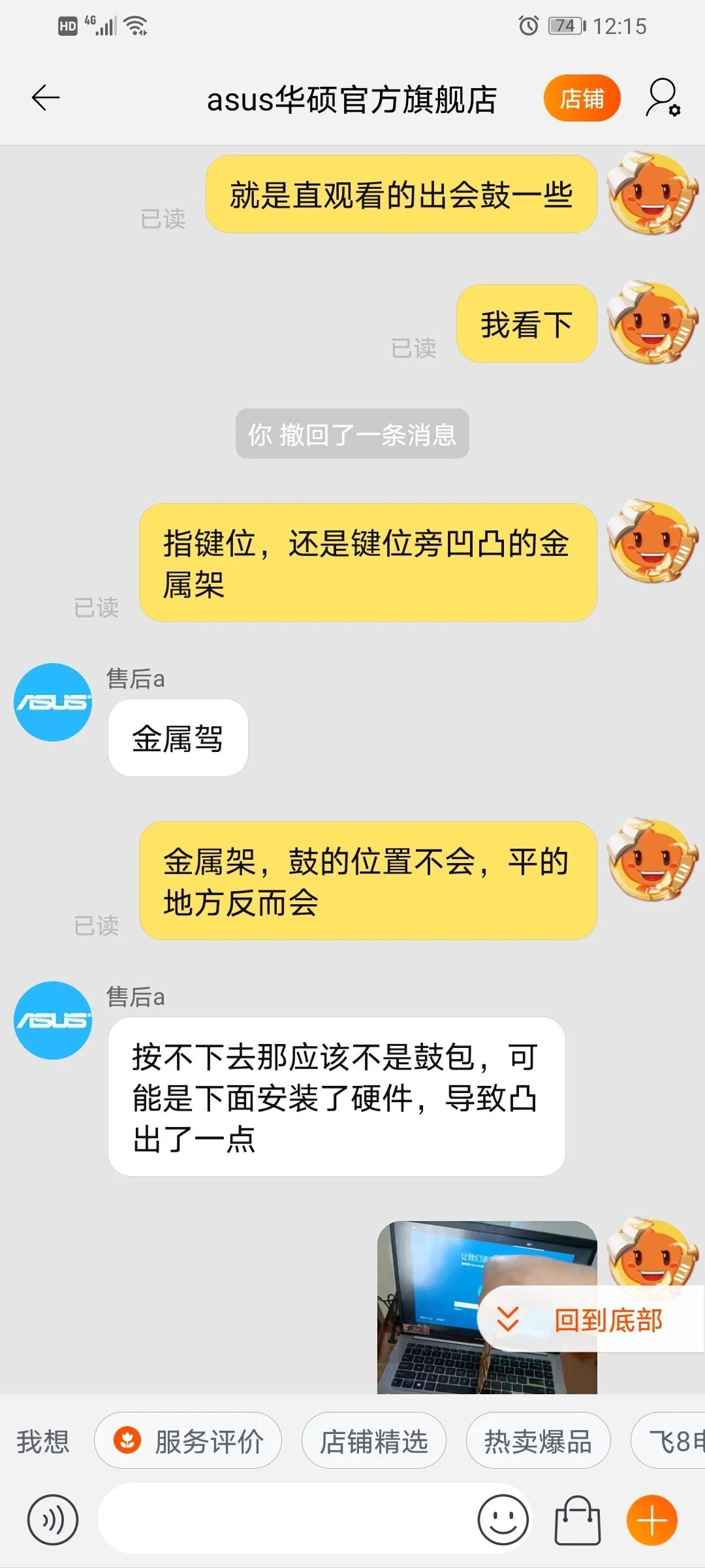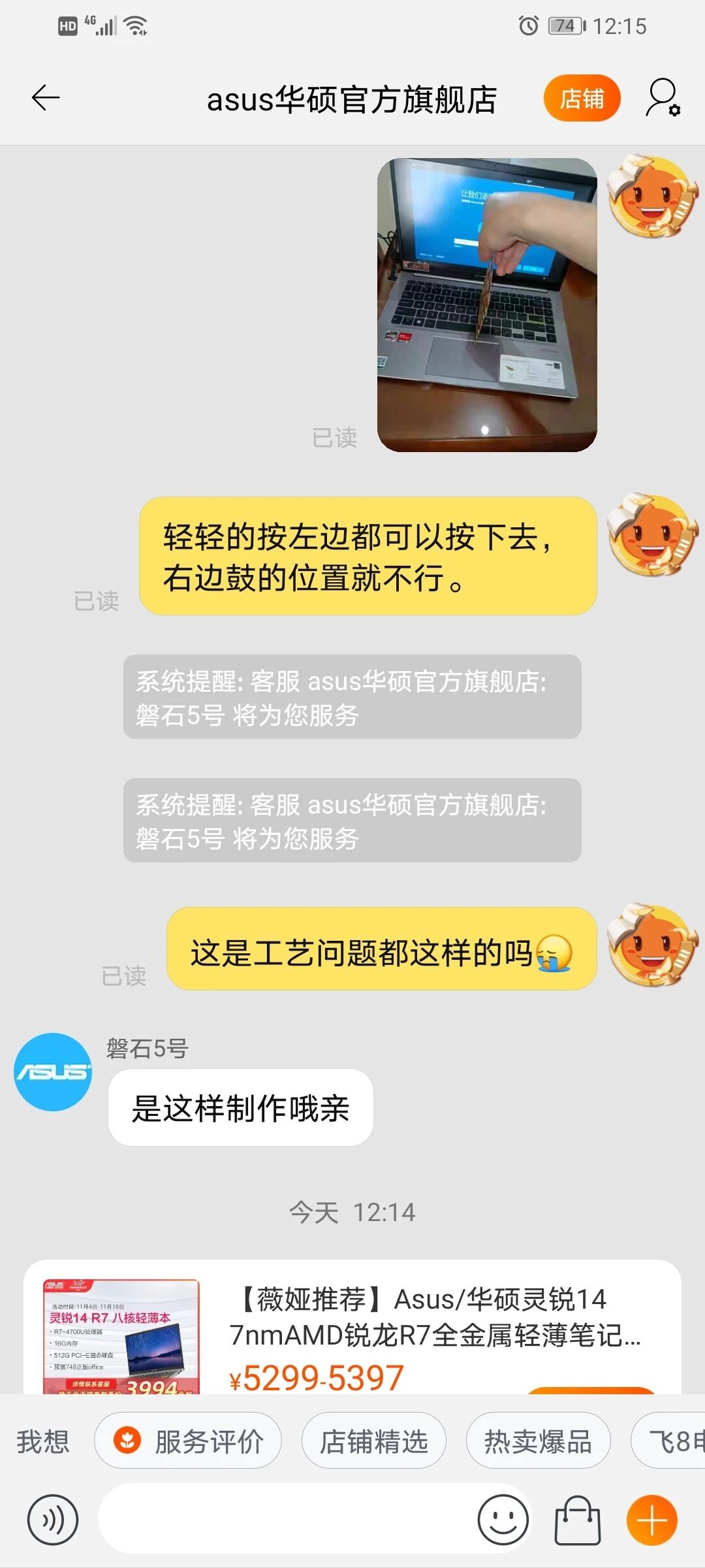 双十一天猫旗舰店买了一台灵锐14,来货L为中间点左右上下两个键位左右有些鼓起来,咨询客服说电脑就是这样会有些鼓起来,难道华硕电脑都这样吗,品控质量有些差,还说是正常的,三千多也懒得退换了,以后还是买别的品牌,不敢在买华硕了,下面有客服聊天记录和我拍照截图给大家看下,吸取教训。
