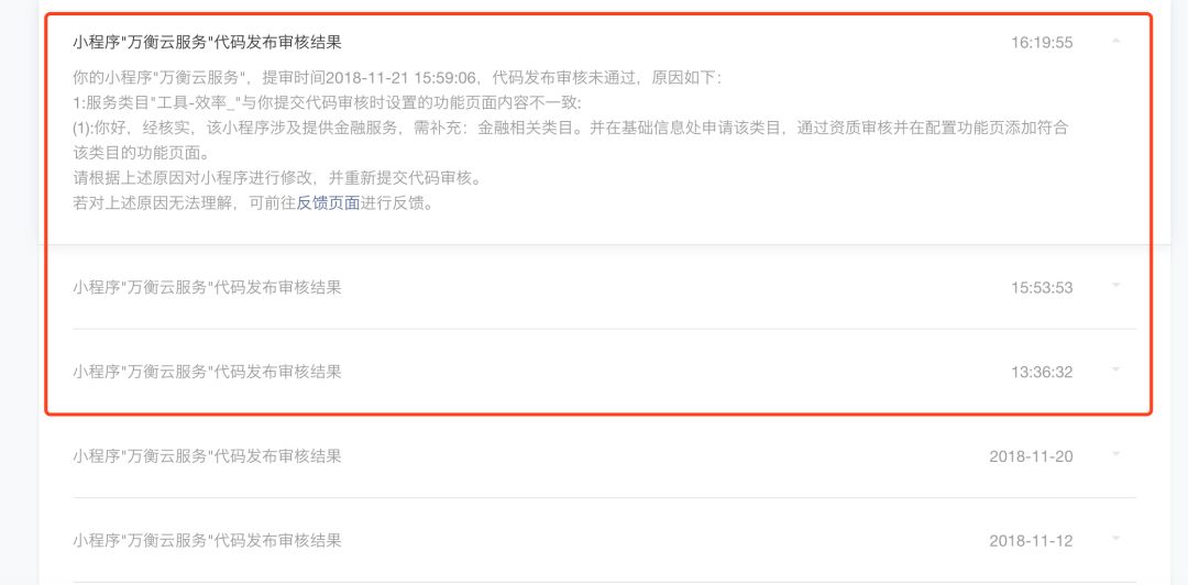 你的小程序"万衡云服务",提审时间2018-11-21 15:59:06,代码发布审核未通过,原因如下: