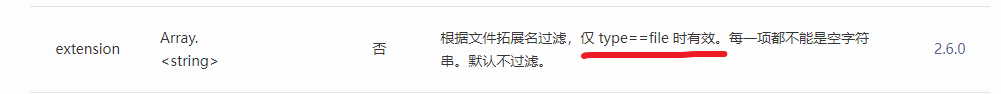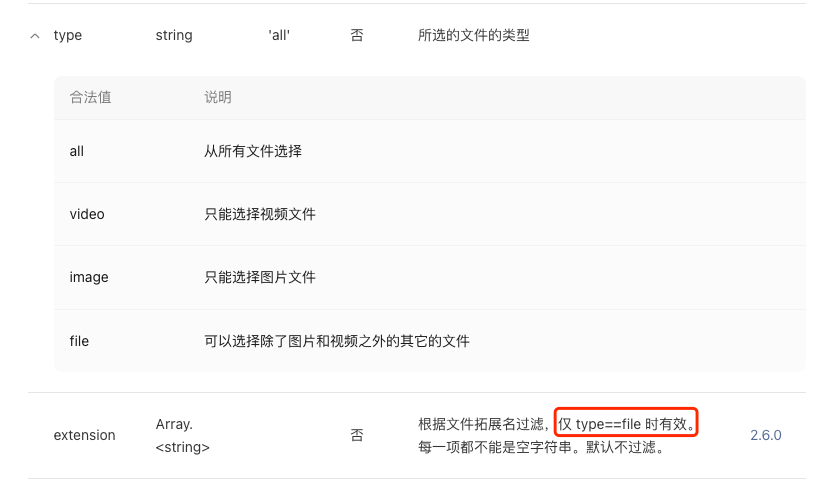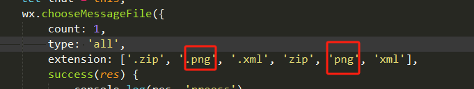 extension 仅 type==file 时有效,参考文档:https://developers.weixin.qq.com/miniprogram/dev/api/media/image/wx.chooseMessageFile.html