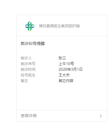 【使用场景2】:就诊叫号提醒:患者在线排队预约就诊,叫号系统根据患者排队序号提前通知患者准备就诊。