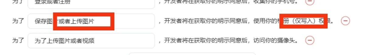 比如【相册(仅写入)权限】的用途是保存图片或保存视频,是没有发布、扫码、上传等功能的哦,建议修改。