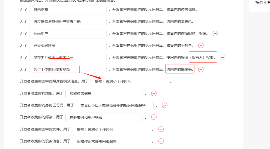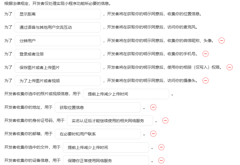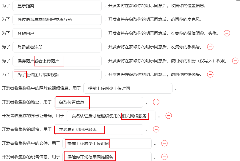 填写模糊,没有真实业务需求;例如:为了用户完成登录,注册,获取头像昵称;你获取用户相册或者摄像头,具体是为了后续哪些服务,并不是为了减少时间。