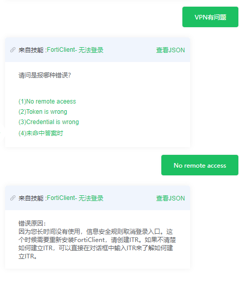 为什么在高级技能多轮会话中是无法选择回答,只能输入?因为选择的时候会多添加前面的序列号,后台就不认了。这个时候请问如何处理,我看到例如:末日生存游戏里面是没有这个问题的,是可以直接点击选择的。