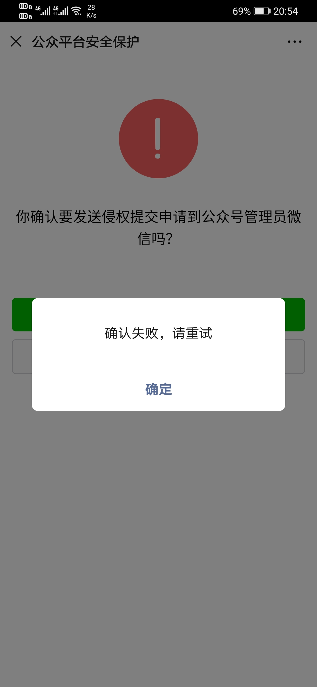根据平台指引,侵权投诉,填写了完全资料,提供了商标注册证书和组织机构代码证,最后一步成功扫二维码后,点击确定按钮提示确认失败. 多次尝试都如此,请问该如何解决?