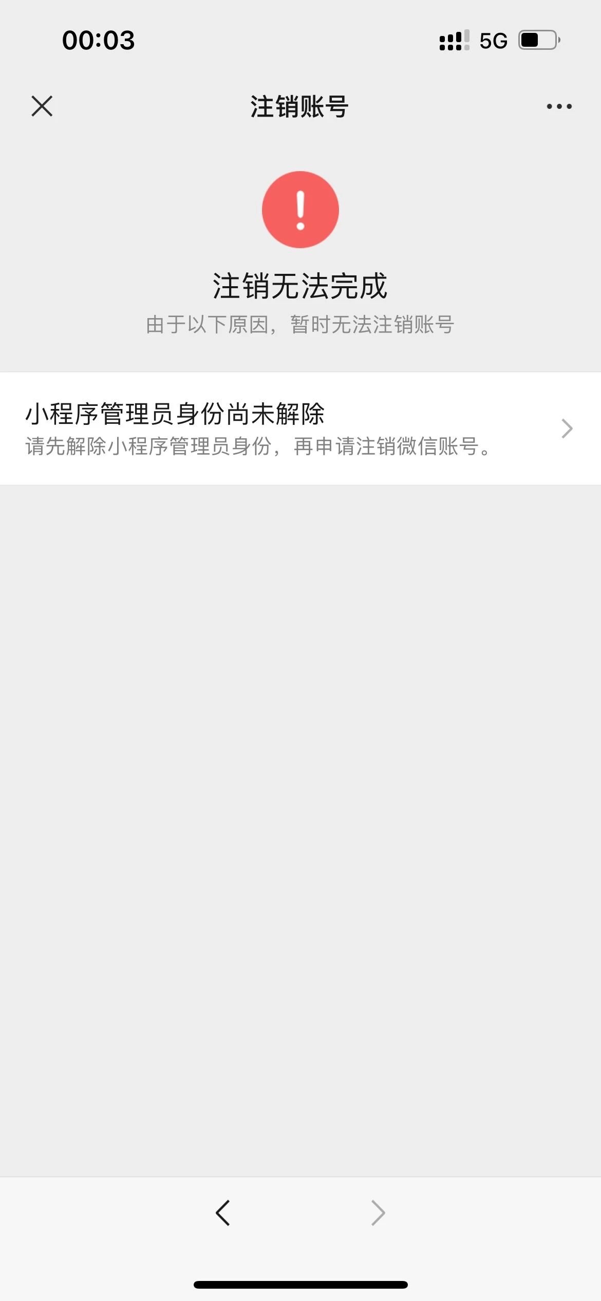 1、微信无法注销,提示小程序管理员身份尚未解除。