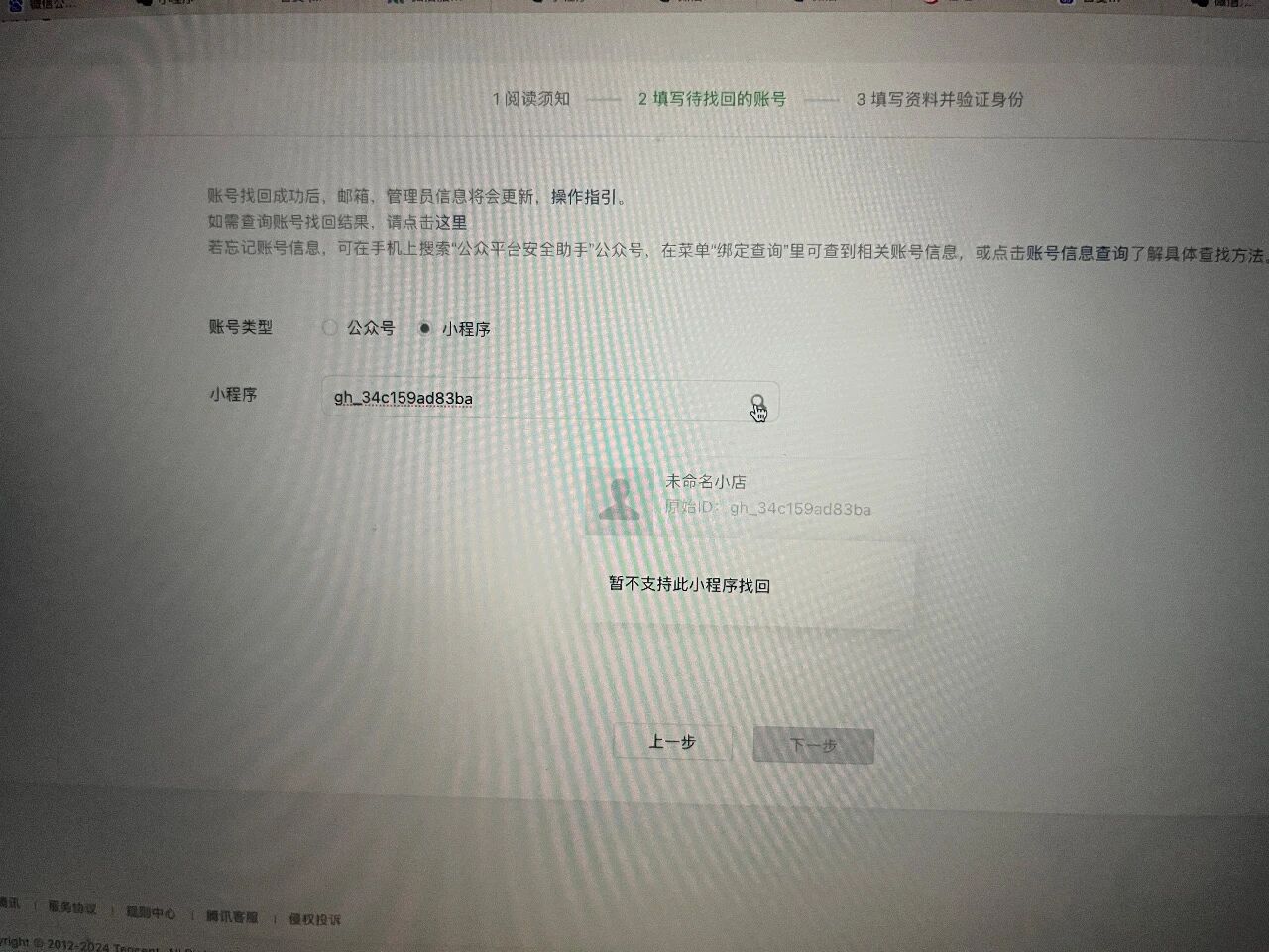 2、到微信公众平台找回此ID小程序的账号时,提示无法找回。