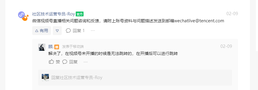 微信视频号直播相关问题咨询和反馈,请附上账号资料与问题描述发送到邮箱wechatlive@tencent.com。