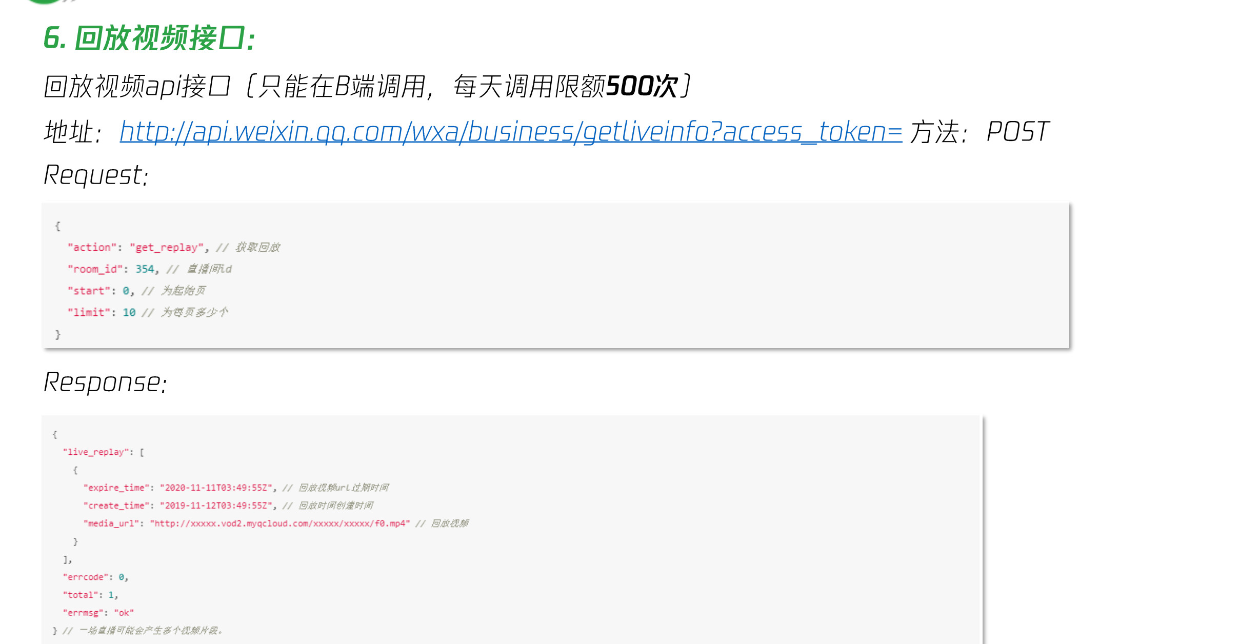 直播回放有的。但是播放需要视频资质,后续官方会集成到插件里 到时候不需要资质。