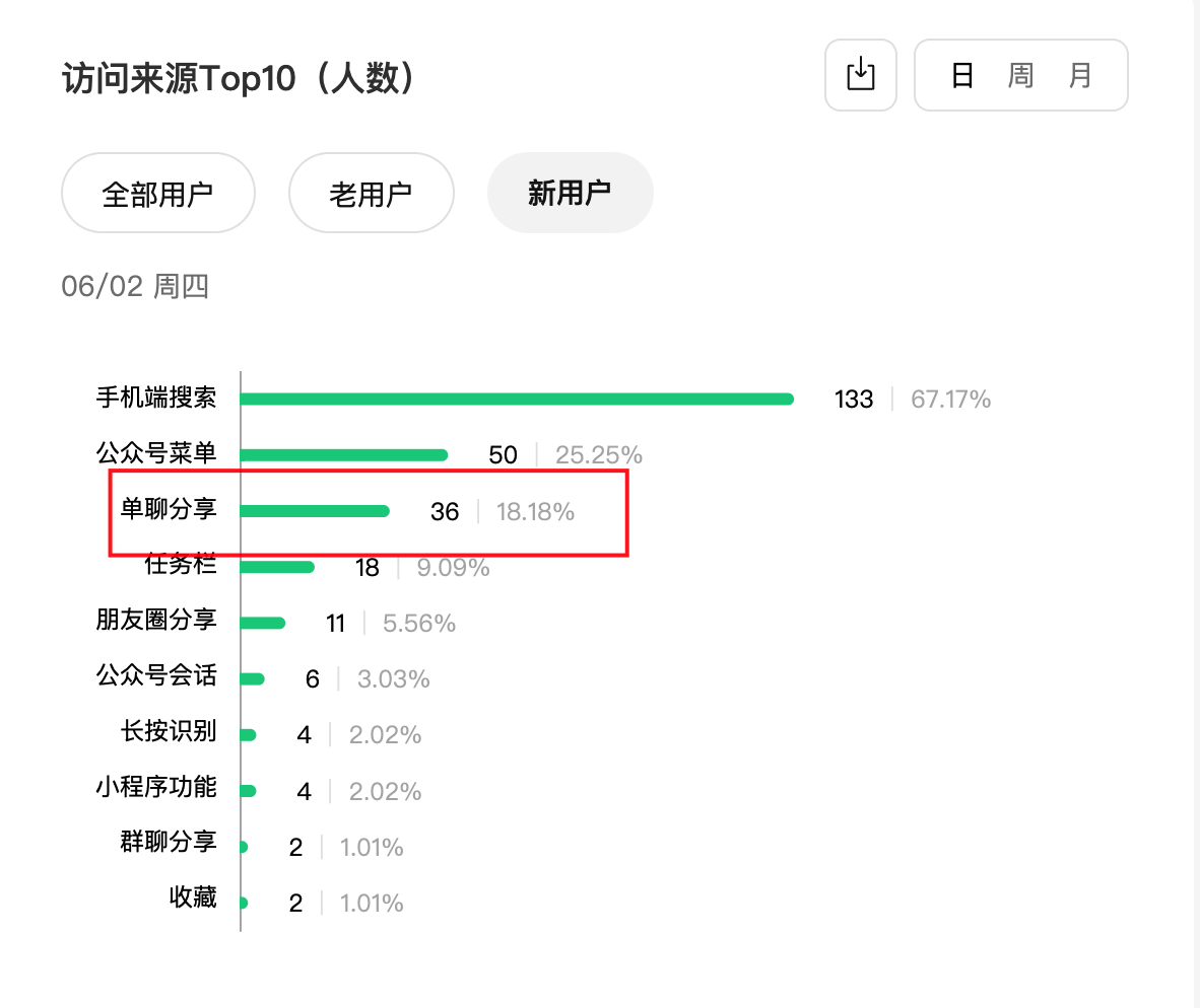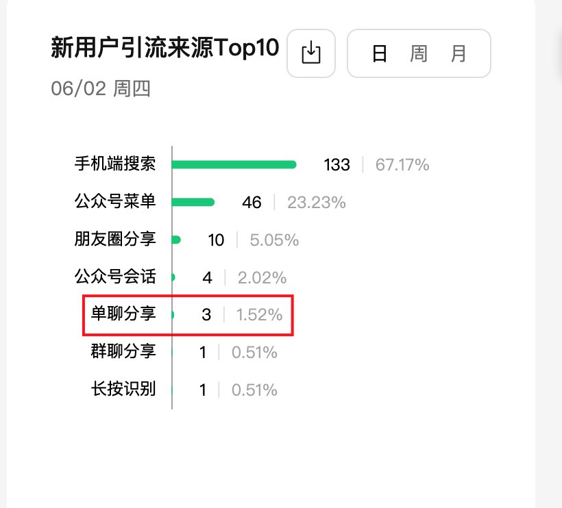 新用户引流来源这里的数据,单聊分享引流来的一共识3个,