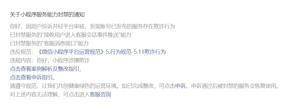 我这边小程序稳定运营了两三年了,但是今天收到涉嫌欺诈的违规,我这边不知道是因为哪里违规了,也没有做调整,麻烦请告知我具体违规的地方,我立刻整改,谢谢,我猜测也有可能是因为我发货发错了,导致用户没有及时收到货而被投诉,麻烦请告知我愿意,谢谢,期待您的回复