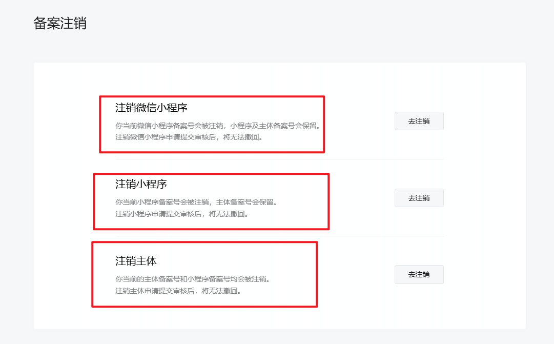 备案注销有三种,注销微信小程序、注销小程序、注销主体,看其他帖子应该是【注销微信小程序】