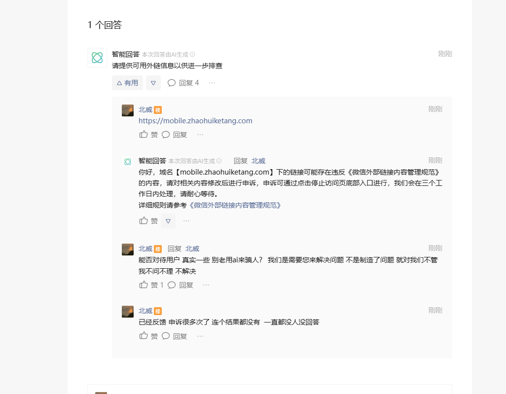 自查内容无违规要素 域名状态一切正常 邮箱也发了 事情都很久了 麻烦腾讯审核人员 作为一下把 有事情 不去处理 最后受损失的是我们 你们作为审核人员应该合理合规的 去审核 而不是用AI 去糊弄用户 审核人员来随便找个借口来处理问题 我们既然反馈了 我希望可以帮助我们一起解决掉问题 而不是推卸责任 不负责任 平台用户这么多 不要让用户都寒了心