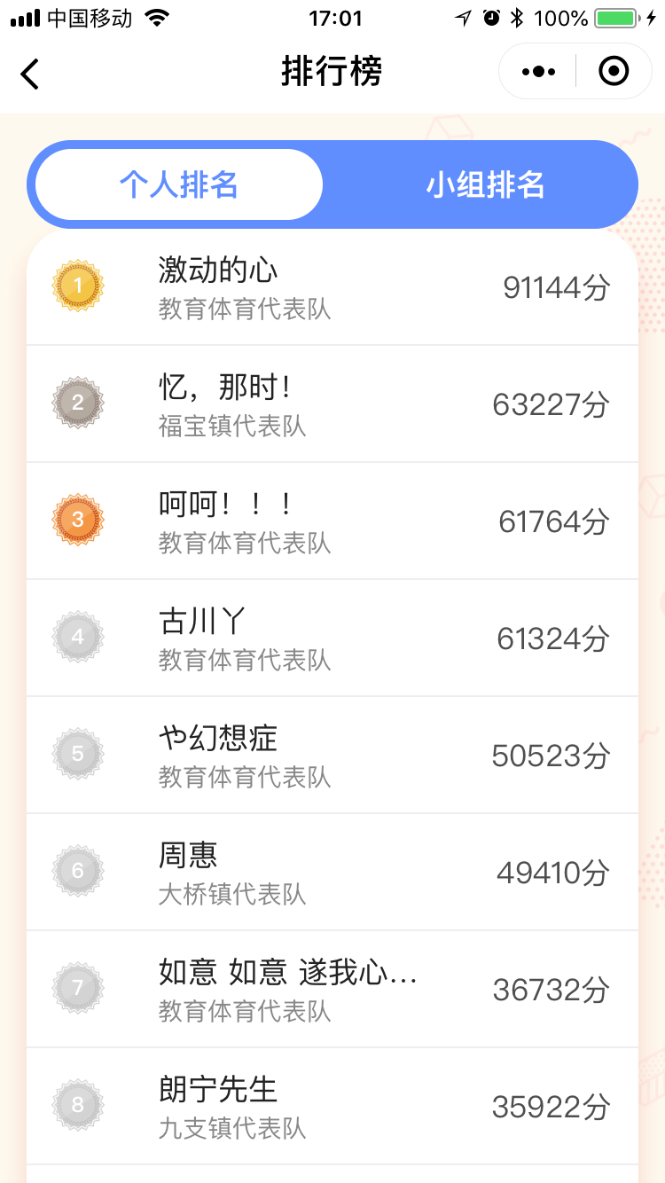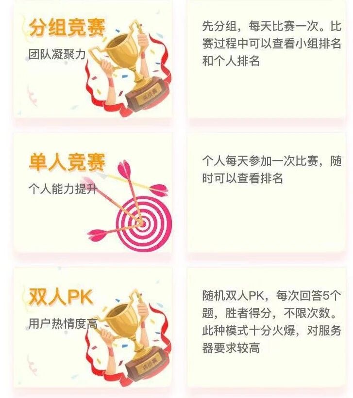 我们给四川合江研发的小程序,就是这种类型。1月份的比赛期间,数个小组比赛得如火如荼,很多用户从早上6点钟就开始比赛,一直比赛到深夜。说明这种模式竞争性强,对知识巩固的效果好。