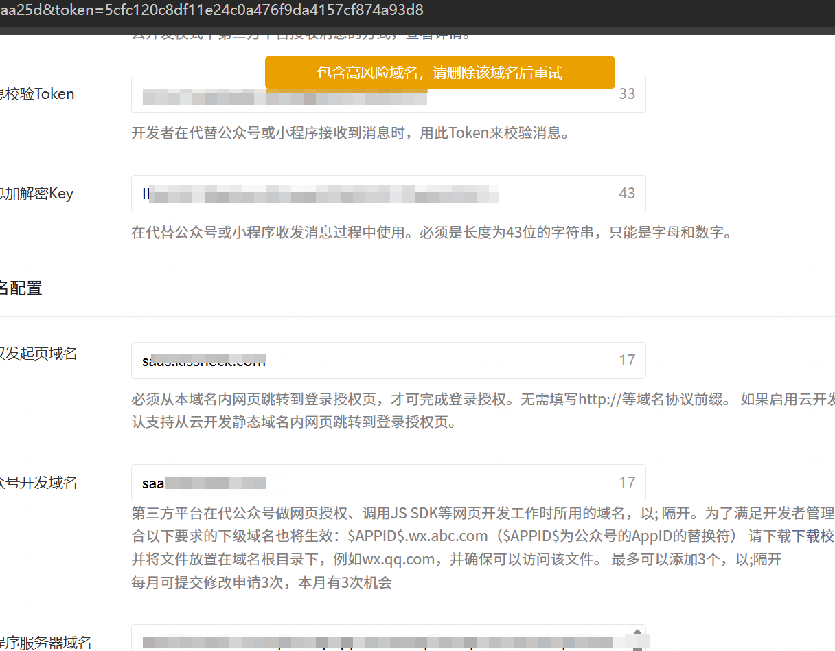 你好,将页面填写的所有域名均在微信中访问,风险提示的就自行申诉处理,可先删掉有问题的域名,再点击保存开发资料按钮