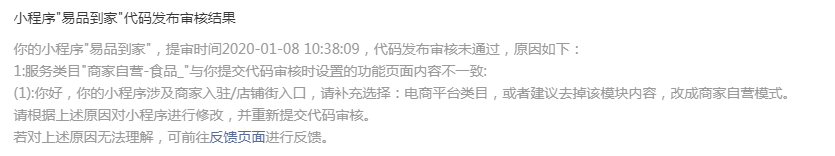 1.2020年1月8日提交审核后,未审核原因如下图,本次更新较上个版本只是加个了文字,文字中并没有提现商家入驻,小程序前端中也无商家入驻模块,该小程序并无商家入驻功能。