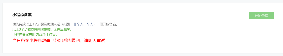 为保证开发者备案体验,存量小程序提交量有动态额度调整,若当日配额消耗完毕,备案入口及提交时均会有相关提示,次日早十点会刷新配额。