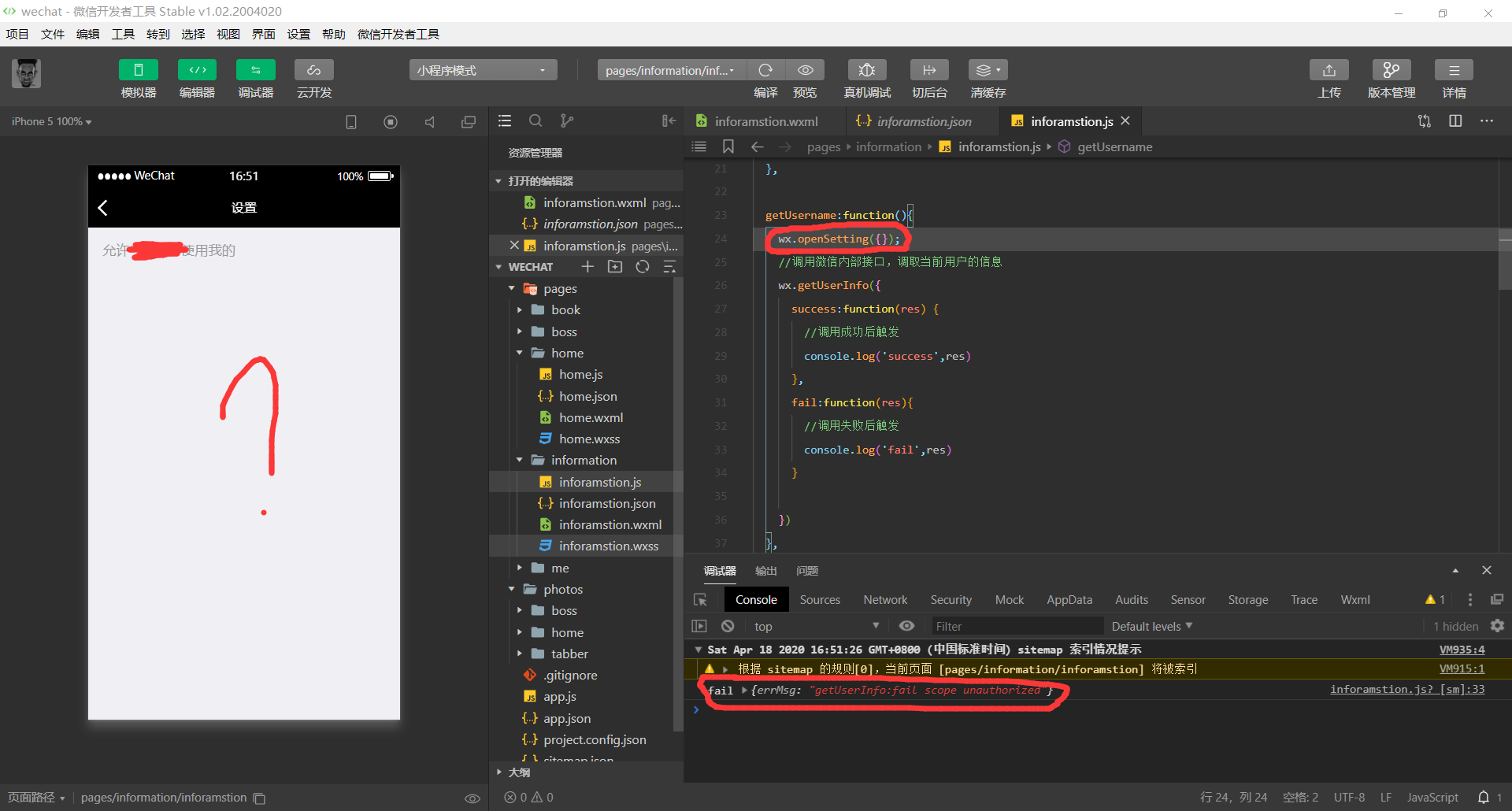 这不是我学的专业领域,自学这个开发的,想请问这个要怎么改,没办法打开用户信息的设置,然后一运行getuserinfo就显示fail