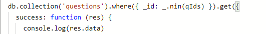 let db = wx.cloud.database();let _ = db.command;let qIds = ['5bafa8c76cdb2ff8d45a2fac','5bafa8c76cdb2ff8d45a2fae'];db.collection('questions').where({ _id: _.nin(qIds) }).get({ success: (res) => { console.log(res) }}) |