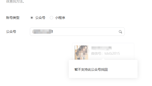 然后我有同样问题的帖子下面提到找回重置,但是直接提示暂不支持此公众号找回