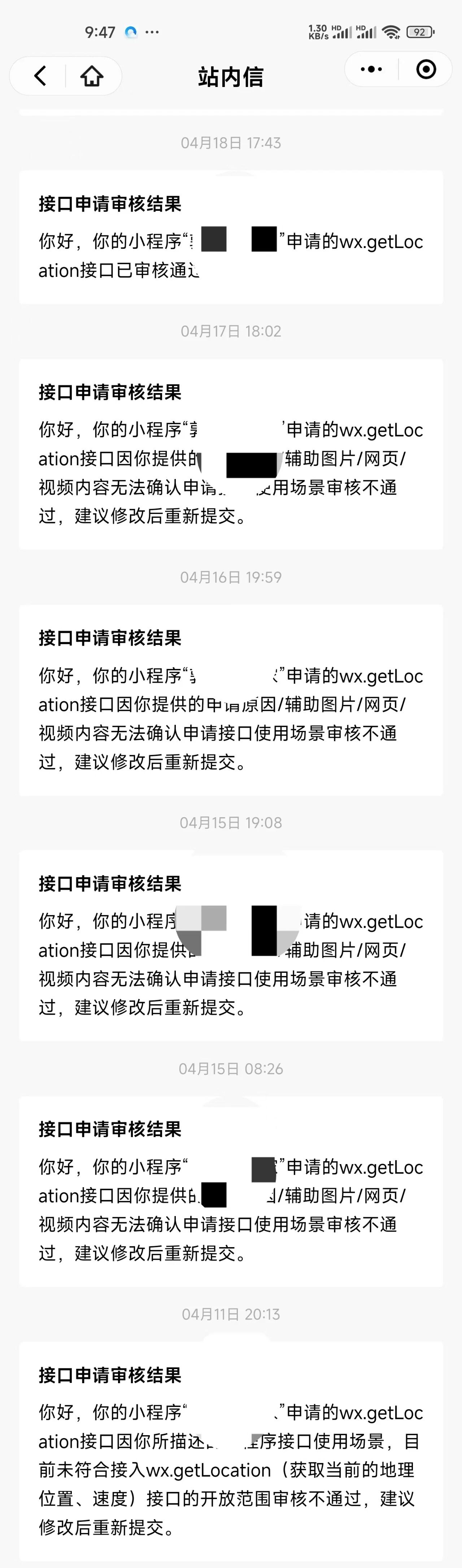 你好,核实到小程序申请wx.getLocation接口申请不通过,根据提交的申请信息可知申请该接口是用于【因业务需要提供线下门店导航服务】,但无法在小程序内体验到具体场景,建议上传小程序内与申请接口相关的完整录屏(含小程序昵称)重新提交审核。可参考相关案例解析:https://developers.weixin.qq.com/community/develop/doc/000646718d40a08a65ed1e2175bc09