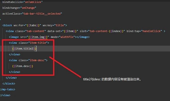 复制官网提供的tabs组件案例代码,为什么在for循环内无法显示titel2和desc数据内容?