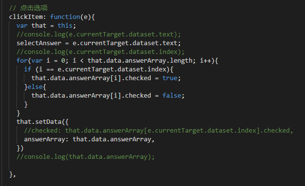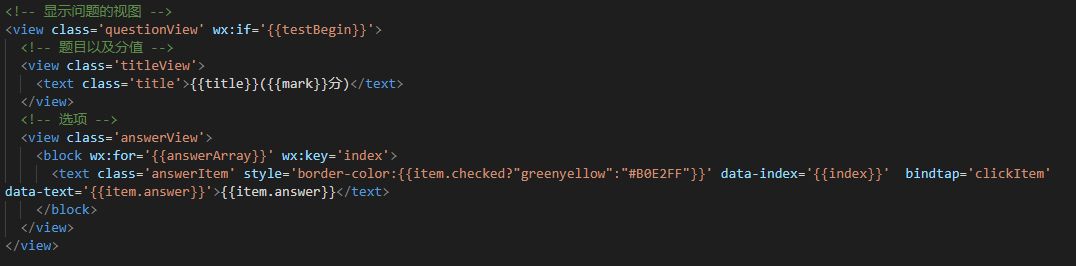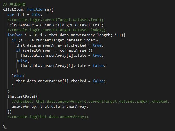 最近在做一个答题的小程序,部分参考了头脑王者,目前在答题阶段遇到一个我无法解的问题,就是题目的答案是通过循环来渲染的,目前我能够做到在答题过程中,也就是倒计时未结束之前,点击答案选项,改变border的颜色,现在的问题是,一题结束后,我会留下一点时间,用来显示正确答案,反馈给用户是否答对了,如果答对了就没啥反应(只是边框没改颜色,但分值会加),但如果答错了,就应该将正确答案显示为绿色,将答错的那个显示为红色,其余默认色,如果规定时间内没有点击选项,也就是未作答,那么也应该显示正确答案为绿色,求大神帮忙解答