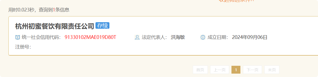 {"name":"杭州初蜜餐饮有限责任公司","code":"91330102MAE019D80T","code_type":1,"legal_persona_wechat":"hhm831***","legal_persona_name":"洪海敏","component_phone":""}