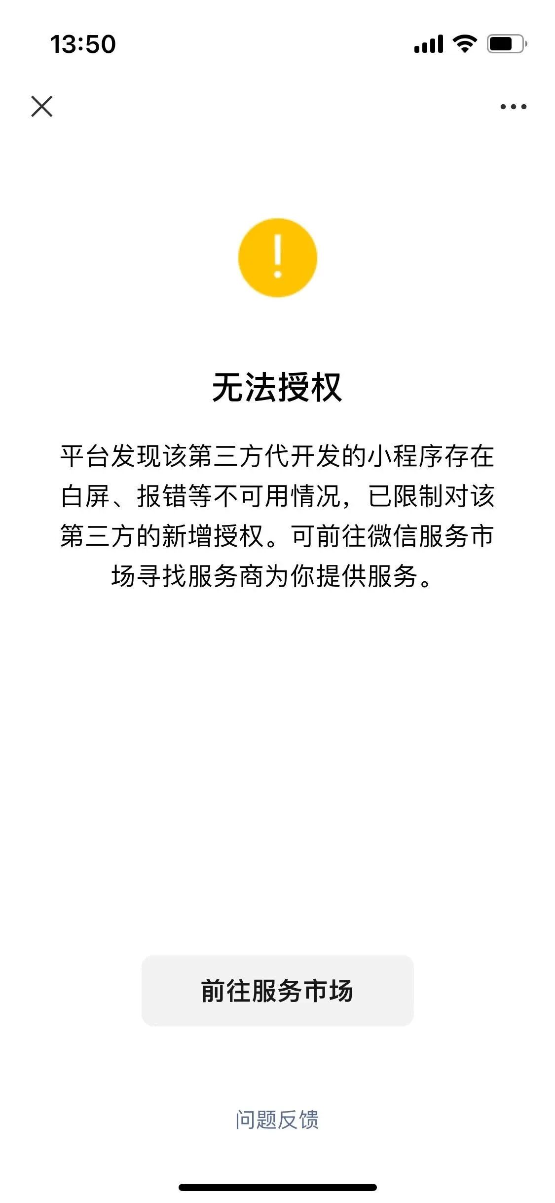 之前一直正常使用,也没收到开放平台的通知,今天新接入授权的时候,就报"平台发现该第三方代开发的小程序存在白屏、报错等不可用情况,已限制对该第三方的新增授权。"