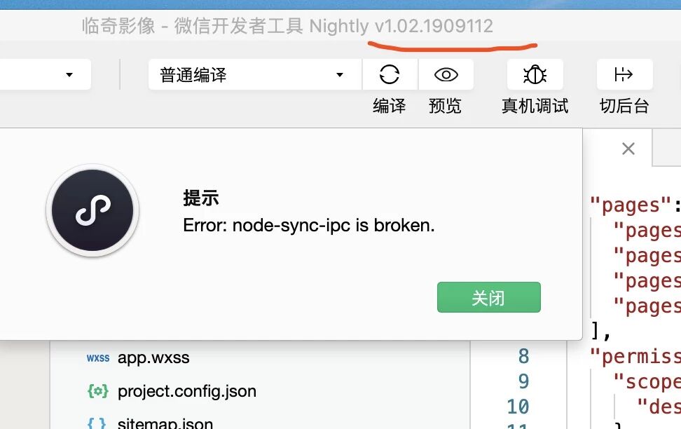 新版工具1.02.1909112不能真机调试error:node-sync-ipc isbroken,重启开发者工具,回退开发者工具都不行。求大佬支招