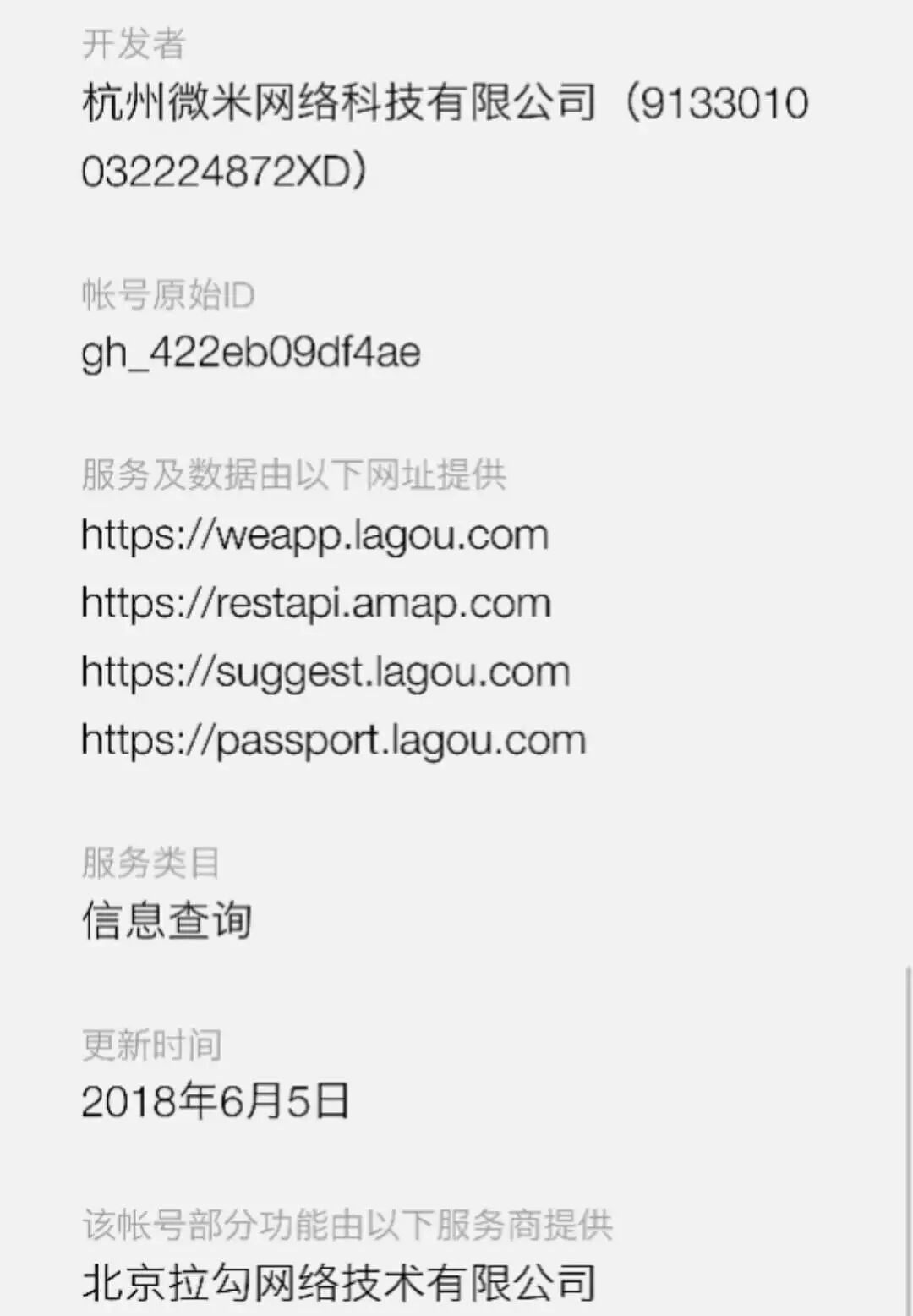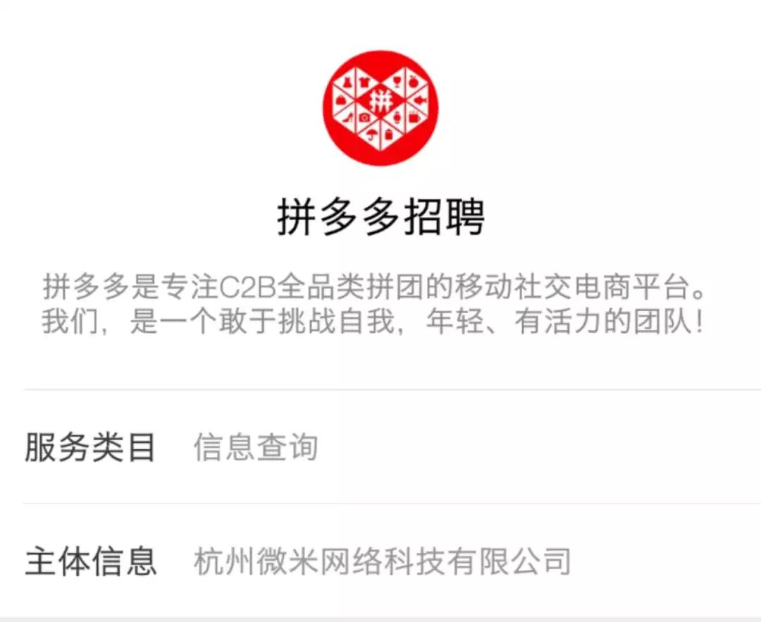 拼多多招聘小程序的服务类目是信息查询,但是能通过“该账号部分功能由以下服务商提供”上线招聘类的服务。