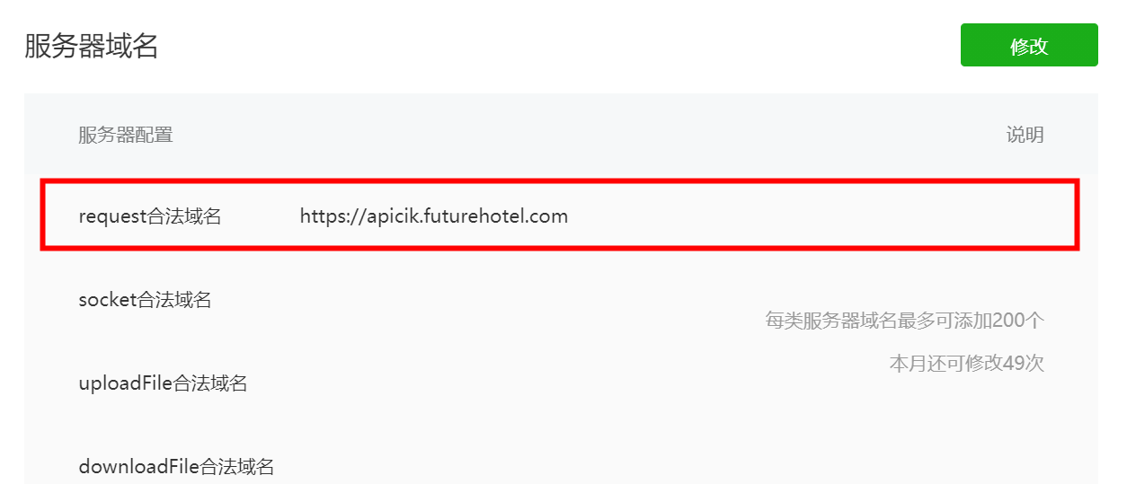 VM8 asdebug.js:1 https://apicik.futurehotel.com 不在以下 request 合法域名列表中,请参考文:https://developers.weixin.qq.com/miniprogram/dev/framework/ability/network.html名VM8 asdebug.js:1 https://apicik.futurehotel.com 不在以下 request 合法域名列表中,请参考文档:https://developers.weixin.qq.com/miniprogram/dev/framework/ability/network.html列表中,请参考文档:https://developers.weixin.qq.com/miniprogram/dev/framework/ability/network.htmllopers.weixin.qq.com/miniprogram/dev/framework/ability/network.html