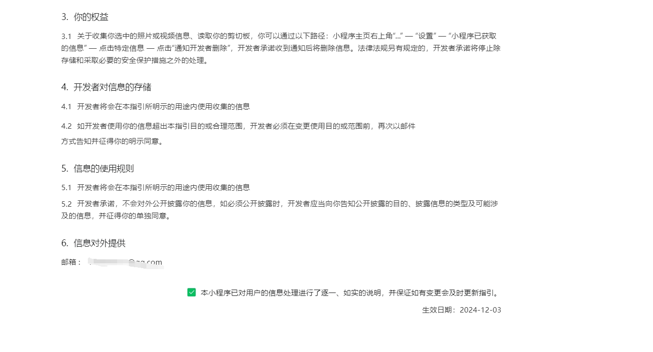 你好,请先检查是否更新或完善小程序《用户隐私保护指引》。可前往“https://mp.weixin.qq.com/登录你的小程序-设置-服务内容声明模块”或代码提审时完善《用户隐私保护指引》。若于到期未完善,将回收小程序隐私接口调用权限,建议你尽快完善小程序得《用户隐私保护指引》。可参考:https://developers.weixin.qq.com/community/develop/doc/00062a6d514c88baacdf52e8a56009