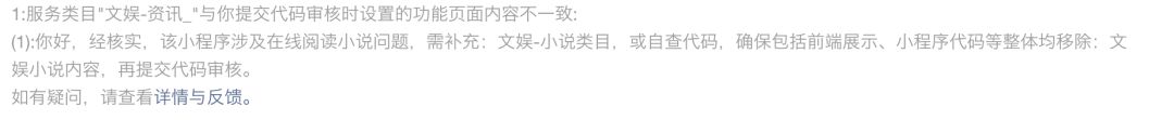 你好,经核实,小程序仍涉及在线阅读小说,请补充选择文娱-小说类目,或自查、处理相关违规内容,确保包括前端展示、小程序代码等整体均没有违规内容。请将相关前端展示、相关代码等均完整去除后,再提交代码审核。