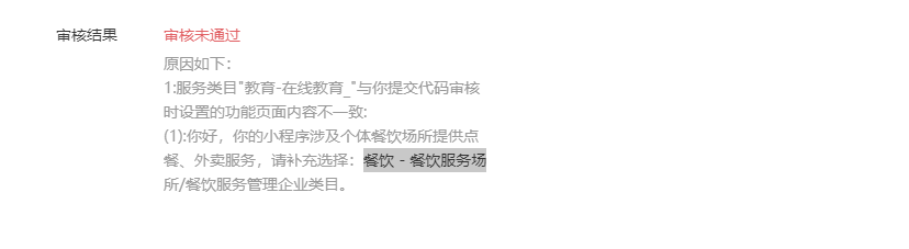 上一次审核已经把有关的这个问题,做出了修改。个体餐饮场所提供点餐、外卖服务。小程序已经不存在这个问题了。为啥还审核不通过。严重影响我司的业务发展,造成了一定的经济亏损。我将面临失业的局面。